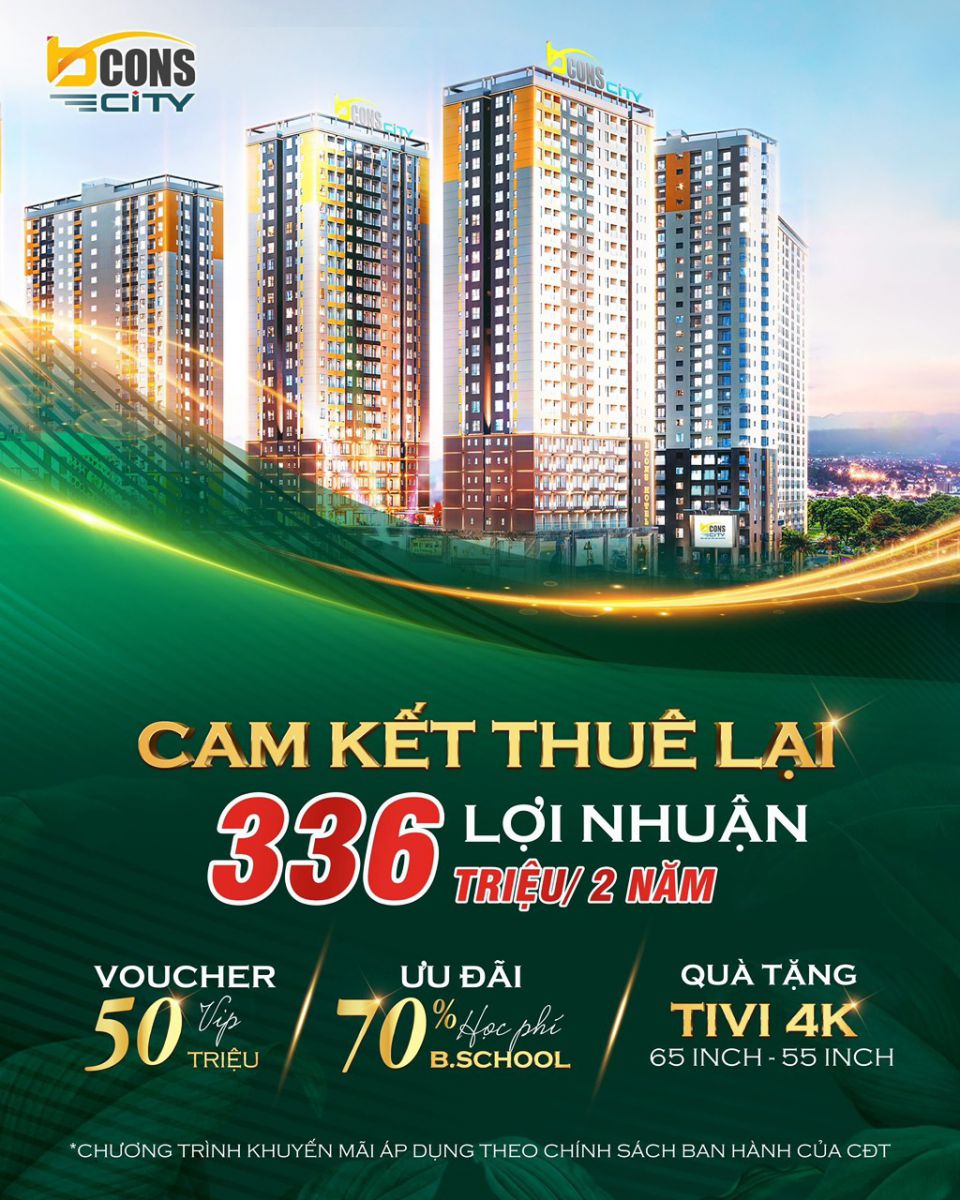 Bcons City là dự án căn hộ chung cư kết hợp trung tâm thương mại, tiện ích cao cấp trên mặt tiền đường Thống Nhất, Dĩ An, Bình Dương do Tập đoàn Bcons làm chủ đầu tư. Dự án được xây dựng trên quỹ đất hiếm có ngay mặt tiền đường 32m giữa trung tâm thành phố, được quy hoạch thành khu đô thị với 5 tháp căn hộ, TTTM và nhà phố. Khi hoàn thành, dự án Bcons City sẽ cung cấp khoảng gần 4000 sản phẩm ra thị trường. Sở hữu nhiều thế mạnh vượt trội từ: giá bán, vị trí, thiết kế thông minh, tiện ích đầy đủ, ….Bcons City đang là lựa chọn an cư tốt cho khách hàng sinh sống và làm việc tại TP.HCM và Dĩ An.