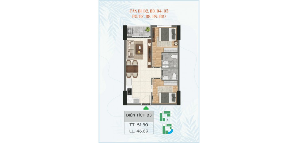 Căn 2PN - 2WC (51,30m²): 2,094,046,588 thanh toán 205 triệu hoàn tất hợp đồng.